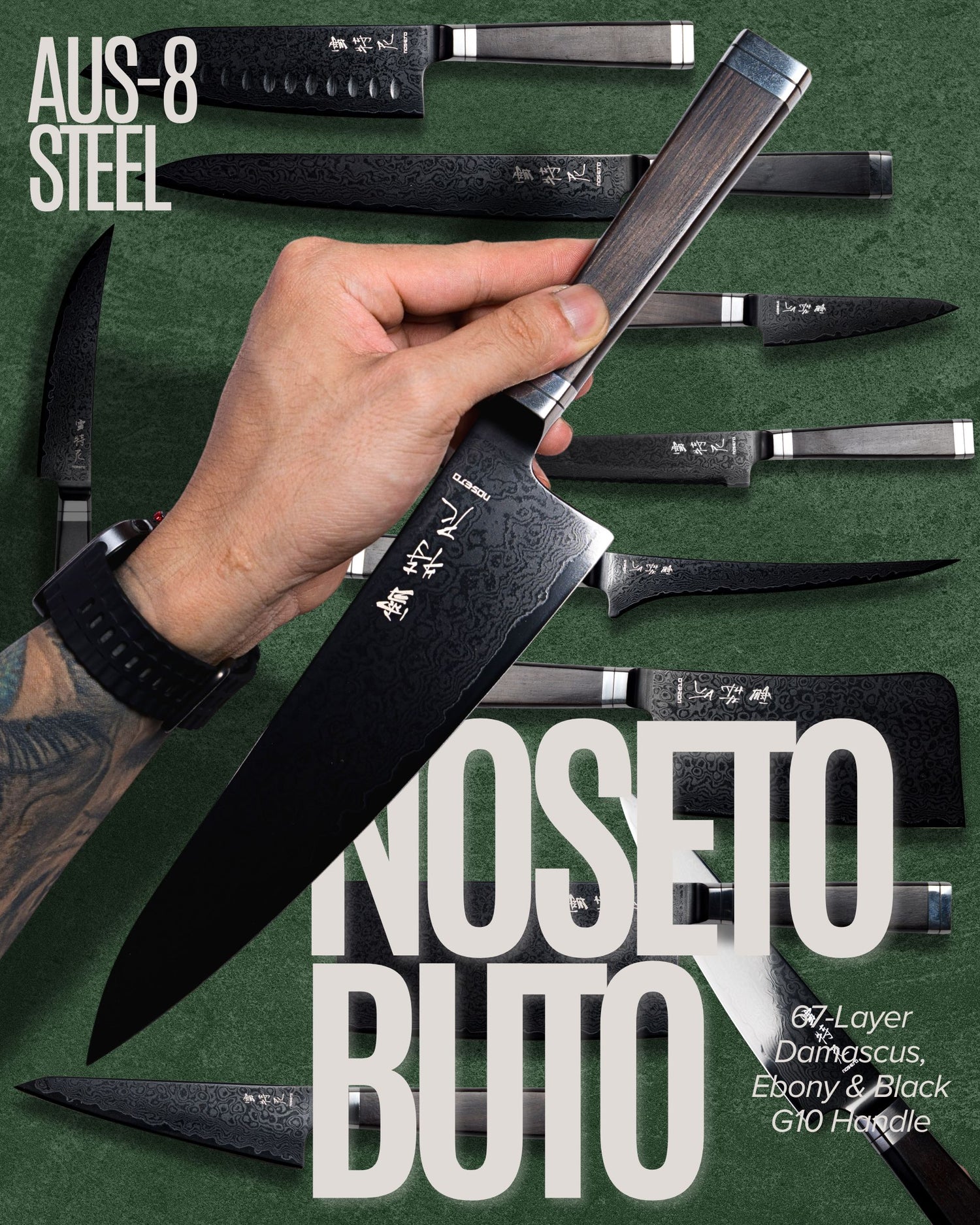 Noseto Buto Gyuto 210mm Aus-8 Black Titanium Damascus Ebony Handle