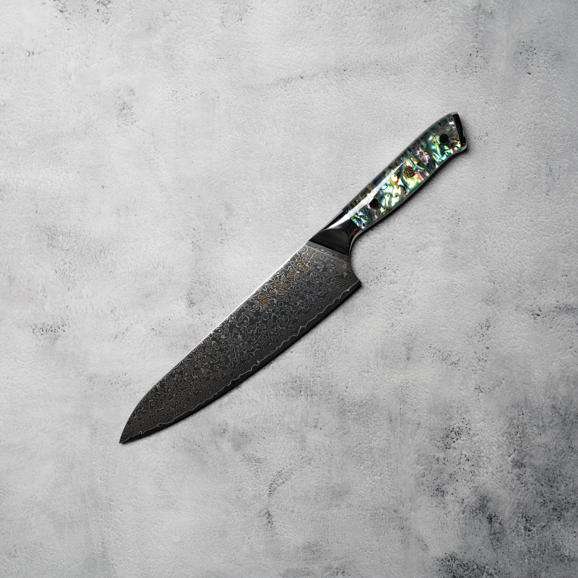The western-style handle is made from abalone resin, offering a comfortable, ergonomic grip and a visually striking appearance. Balanced and secure, it allows for effortless handling during extended prep sessions.