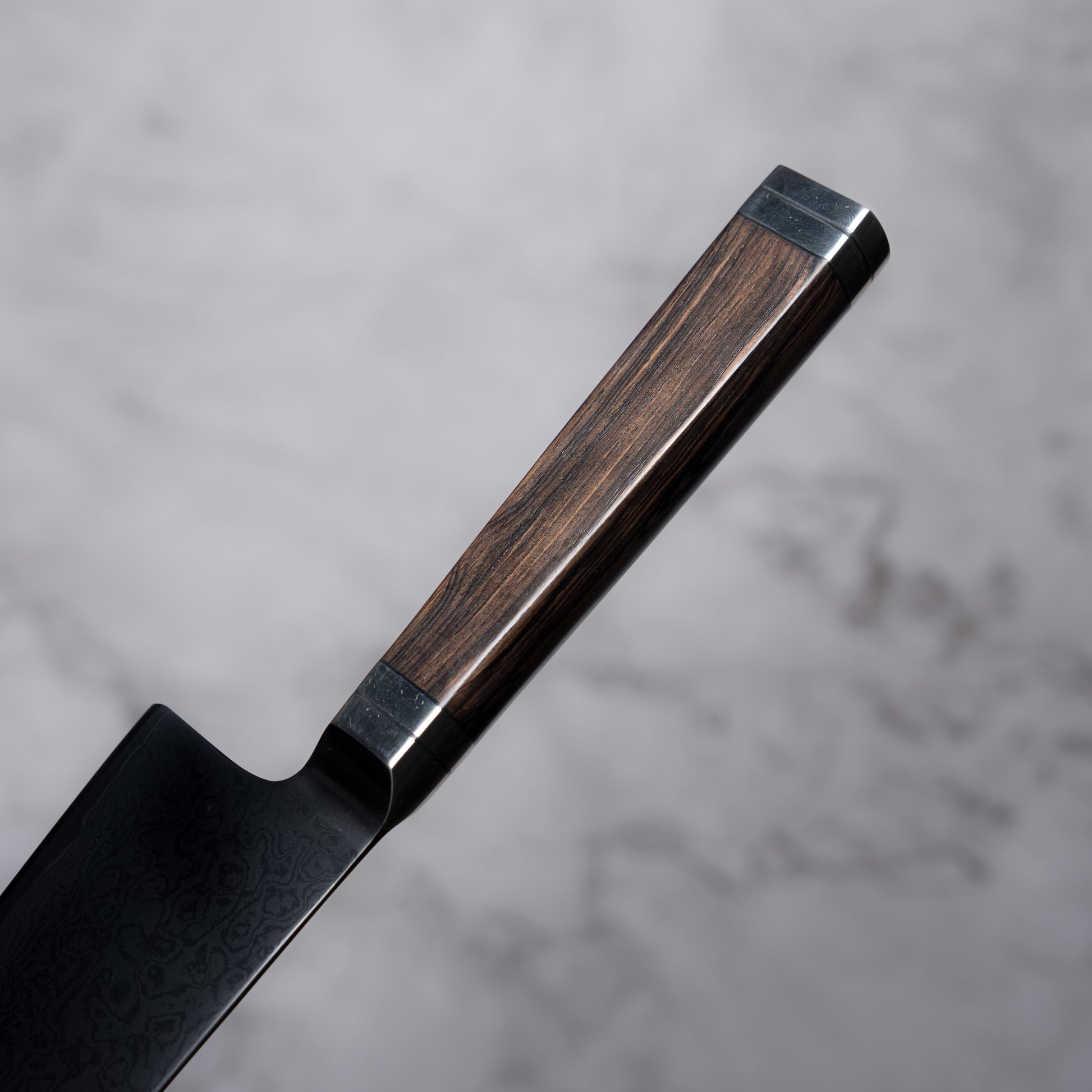 The handle features a traditional four-sided Japanese design, crafted from selected ebony wood accented with black G10 spacers. Carefully hand-polished, it offers a refined texture, balanced weight, and a comfortable, secure grip that complements the blade’s elegant profile.